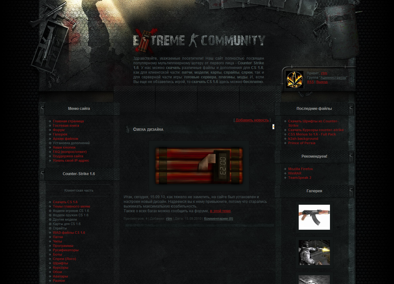 1. Тематика - Cайт полностью посвящен популярному мультиплеерному шутеру от первого лица - Counter Strike 1.6. 2. Адрес сайта - http://rtm.ucoz.ru/ 3. Скриншот (Не обязательно!) 4. Оценку чего вы бы хотели получить - дизайн